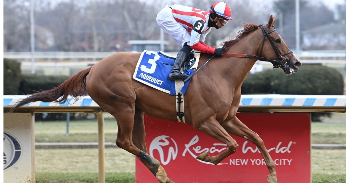 Klaravich Stables’ Weigh the Risks made easy work of four rivals with a dominant 9 3/4-length victory in Saturday’s Listed $150,000 Go for Wand, a one-turn mile for fillies and mares 3-years-old and up, at Aqueduct Racetrack.